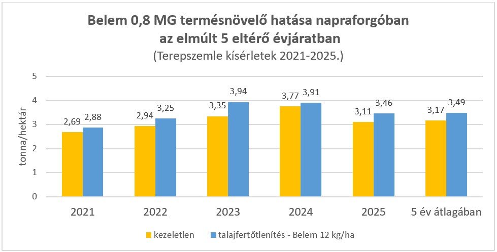 Terepszemle kísérletünkben amikor a drótférgek nem okoztak szembetűnő hiányt a kelésben, a Belem 0,8 MG kezelés átlagosan 320 kg/ha-os többlettermést okozott napraforgóban.