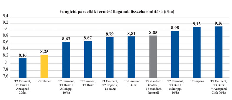 A legnagyobb termésátlagot a 2 nóduszos korban permetezett 1 l/ha Eminent és virágzás elején kijuttatott 0,33 kg/ha Buzz Ultra + 20 l/ha Azospeed Cink fungicid technológia adta.